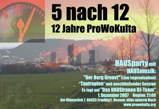 Seit gut einem Jahr lebe ich nun hier auf dem Frankfurter Berg am Rand von Berkersheim. Hier in "Freakhausen" gibt es eine coole Szene an Musikern und anderer interessanter Menschen. Seit einiger Zeit treffen wir uns in unregelmäßigen Abständen in meinem gemütlichen Klanglabor zu Sessions. Wir bewegen uns weg von ausgelatschten Pfaden der Rock-Musik und seiner unsäglichen Kombination von zu lautem Schlagzeug und zu lauten Verstärkern, wo nur noch in Mustern kommuniziert wird die uns die sterbende Musikindustrie vor Jahrzehnten aufgezwungen hat. Wir spielen frei improvisierte elektroakustische Musik aus der Ruhe heraus und mit Ekstase in den Moment hinein. Beispiele unserer Musik kann man hören auf http://emptyblaukraut.blogspot.com/search/label/SESSIONS und http://www.acidrocknroll.org/derberggroovt.htm , sowie http://profile.myspace.com/index.cfm?fuseaction=user.viewprofile&friendid=122904858
